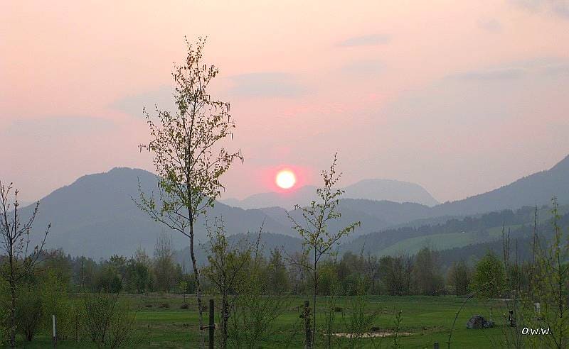 Streulicht des Sonnenaufgangs und -untergangs im Gebirge hat.